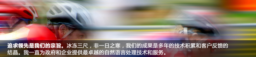 自從成立以來,我們?yōu)榭蛻籼峁└咝Ш椭悄芑男畔⑻幚砉ぞ吆妥稍兎?wù)。在這個(gè)信息爆炸的時(shí)代,如何讓互聯(lián)網(wǎng)上和企業(yè)內(nèi)部的海量信息為我們帶來更多的價(jià)值需要高度智能化的信息處理工具。我們提供的技術(shù)能夠高效并且準(zhǔn)確的對(duì)大量文本信息進(jìn)行處理、檢索、挖掘、翻譯等工作,并可方便地與信息系統(tǒng)的其他模塊進(jìn)行整合。